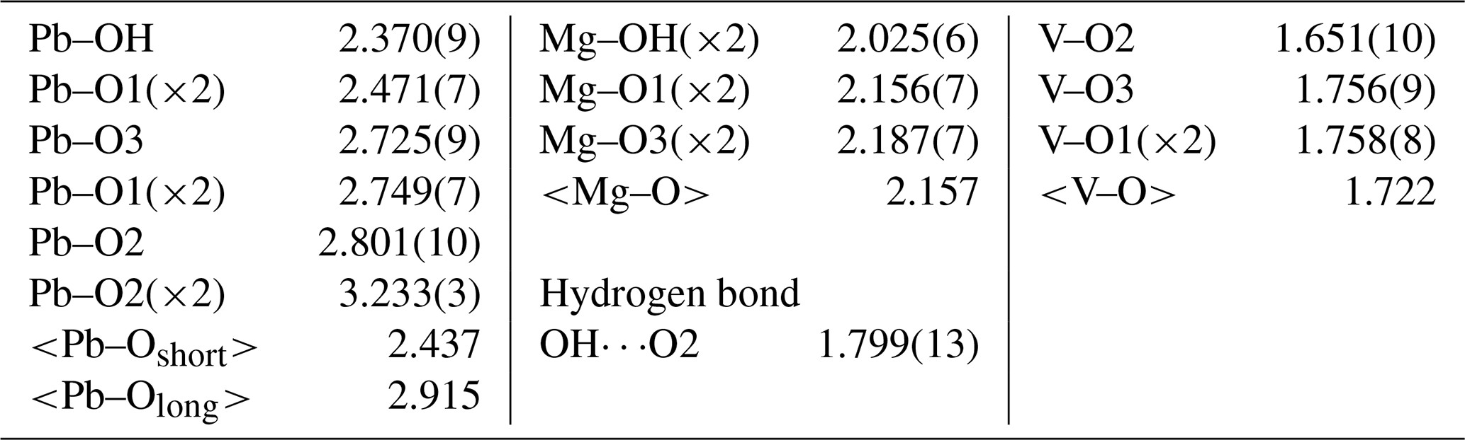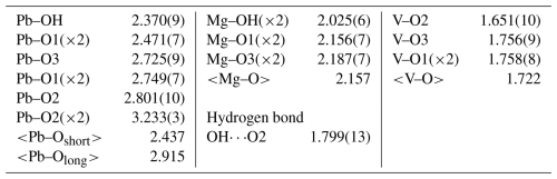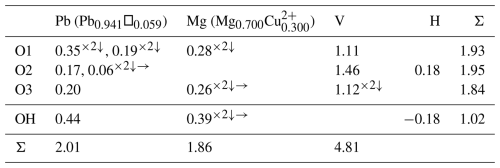The structure solution in Pnma located all non-hydrogen sites, which were successfully refined with anisotropic displacement parameters. The occupancy of the Pb site was refined to 0.941(12). This compares reasonably well with the results of the EPMA, which provided 0.89 Pb apfu; however, because the EPMA showed an excess of 0.05 cations assignable to the Mg site, the possibility exists that a small amount of Mn2+ could be hosted in the Pb site. The refined site-scattering value of 308.64 e for the Pb site is consistent with the site occupancy (Pb0.93Mn0.05□0.02). The Mg site was refined with joint occupancy by Mg and Cu resulting in an occupancy of Mg0.700(17)Cu0.300(17) for a site-scattering value of 68.40 e. If 0.05 Mn apfu is assigned to the Pb site, the empirical formula based on the EPMA has (Mg0.77CuMn) in the Mg site, which yields a site-scattering value of 63.00e. This suggests that the structure crystal contains less Mg and more Cu and/or Mn than provided by the EPMA. For example, (Mg0.68CuMn) in the Mg site would provide a scattering value of 68.48 e. Efforts to locate the H site were unsuccessful. The data collection and refinement details are given in Table 3, atom coordinates and displacement parameters are given in Table 4, selected bond distances are given in Table 5, and a bond valence analysis is given in Table 6. The bond valence analysis (using the refined site occupancies) clearly indicates that OH is OH−, and all other O sites are O2−.
