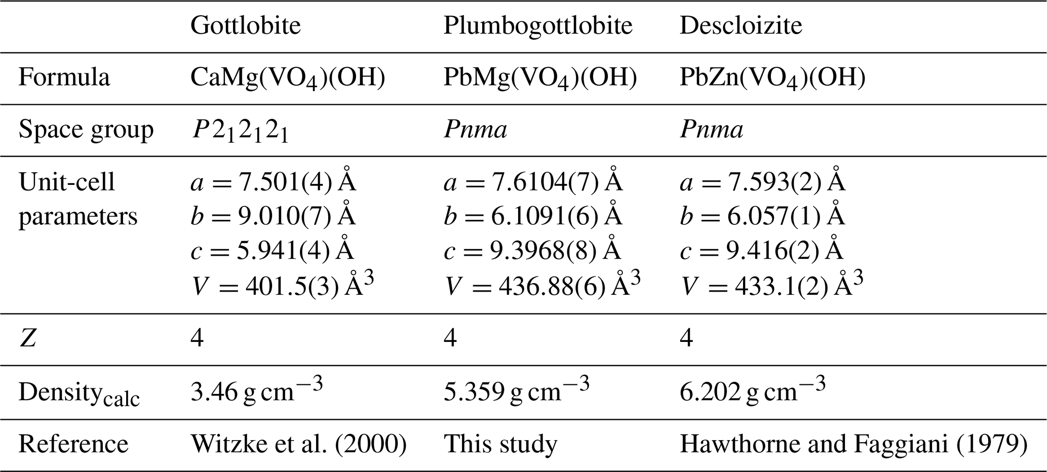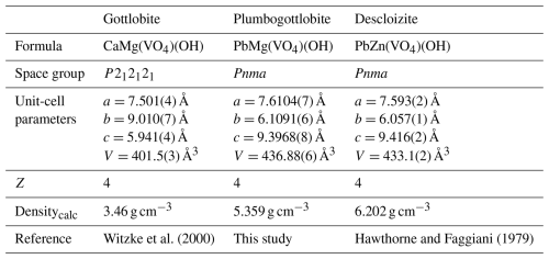 Plumbogottlobite has the same structure as descloizite, PbZn(VO4)(OH), and other minerals with the descloizite structure type. It is the Pb analogue of gottlobite and the Mg analogue of descloizite; selected data are presented in Table 7. As noted by Đorđević et al. (2016), gottlobite, CaMg(VO4)(OH), has an adelite-type structure with space group P212121, which is topologically equivalent to the descloizite structure. Đorđević et al. (2016) noted that most phases with the descloizite–adelite structure topology that have the descloizite structure type are lead vanadates.