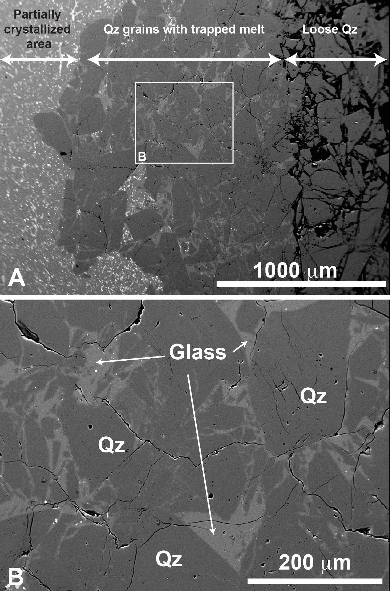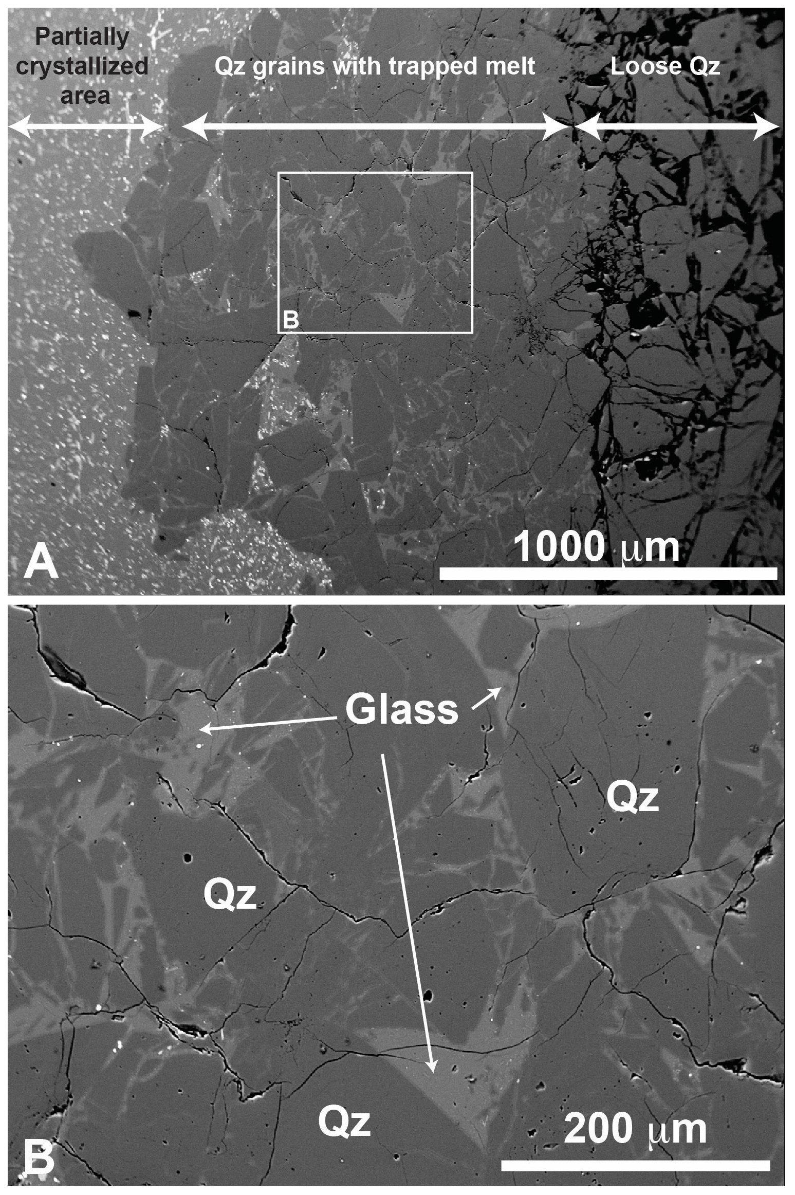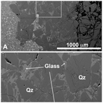 Figure 3(A) BSE images of the quartz (Qz) trap in the 775 °C experiment. The partially crystallized assemblage from the first-step experiment can be observed on the left side of panel (A), and quartz grains are on the right side. Part of the cavities between the quartz grains is filled with glass. A detail of the area in the white rectangle in panel (A) is displayed in panel (B), highlighting the successful trapping of melt domains without crystals.
