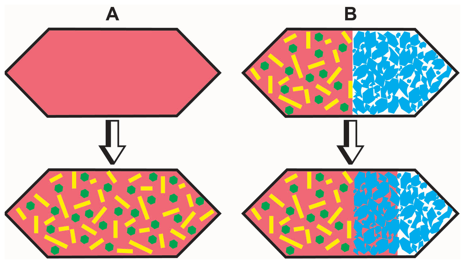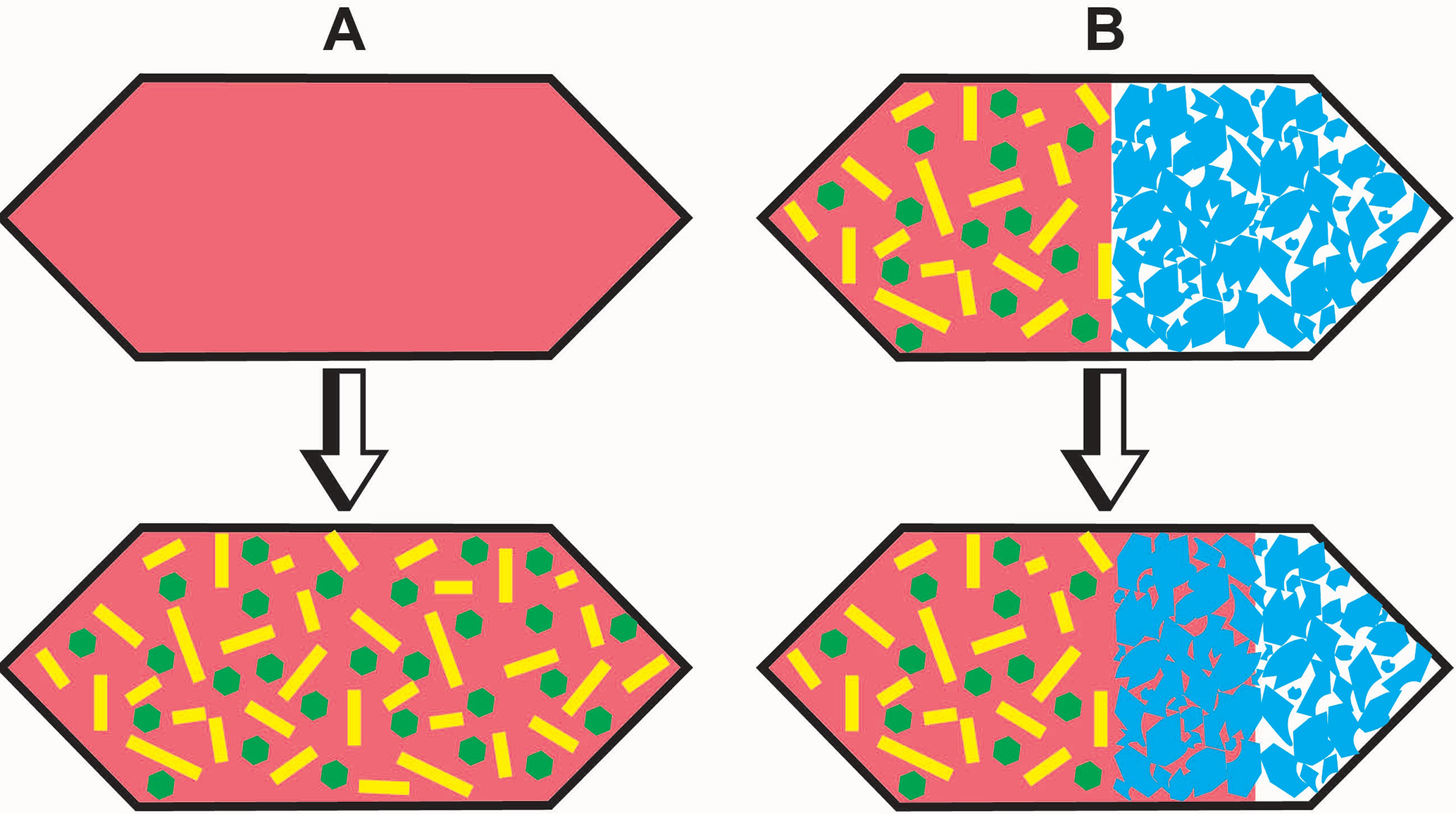 Figure 1(A) Schematic sketch of the first-step experiment. A glass powder is loaded into a capsule, and a partial crystalline sample is produced during the experiment. Reddish colour: glass; green and yellow: minerals. (B) Schematic sketch of the second-step experiment. Part of the product from the first-step experiment is loaded into a capsule also containing the trap material (quartz). During the experiment melt is sucked into cavities of the trap material. Red: glass; green and yellow: minerals; blue: trap material.