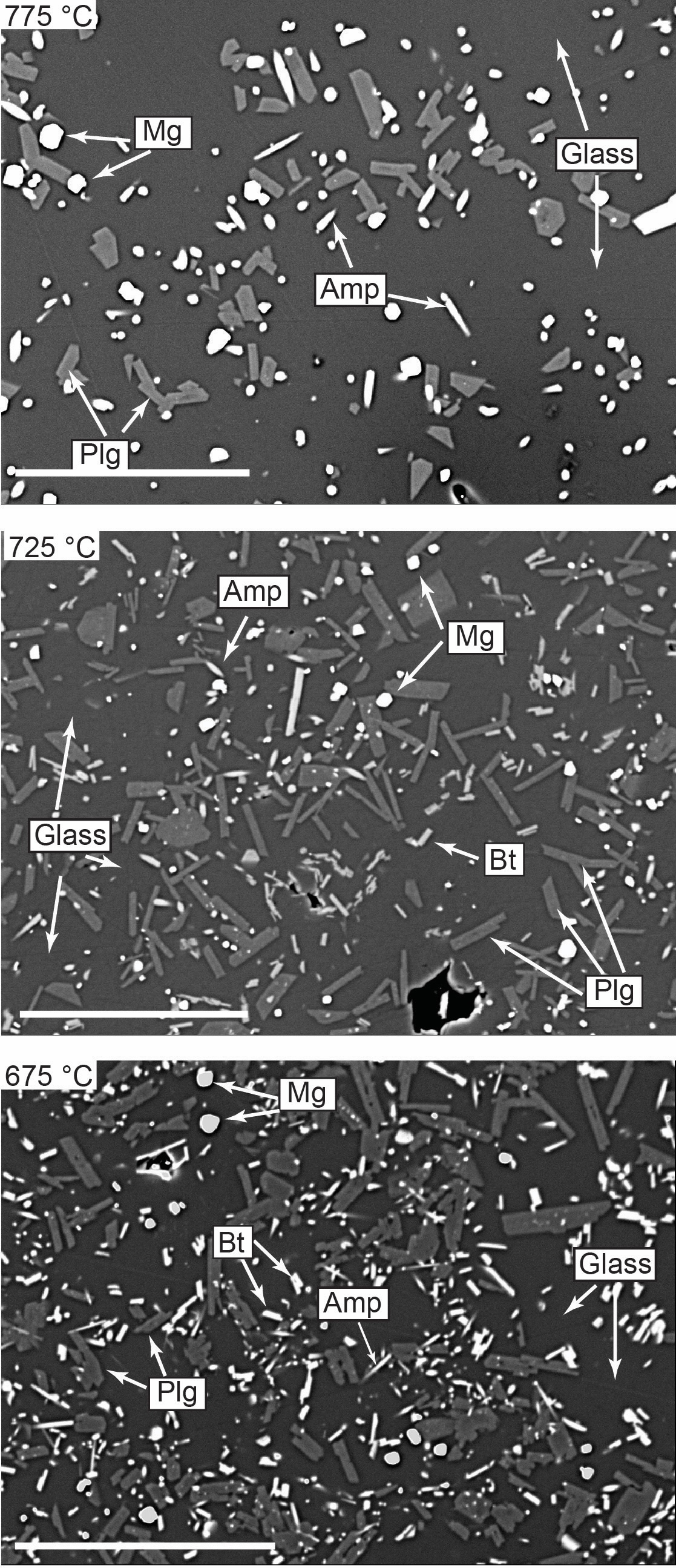 Figure 2Back-scattered electron images of experimental products over the investigated temperature range (675–775 °C). Mineral abbreviations: Amp: amphibole; Bt: biotite; Mag: magnetite; Plg: plagioclase. The scale bar is 50 µm. Note that the melt fraction increases with increasing temperature, as expected.