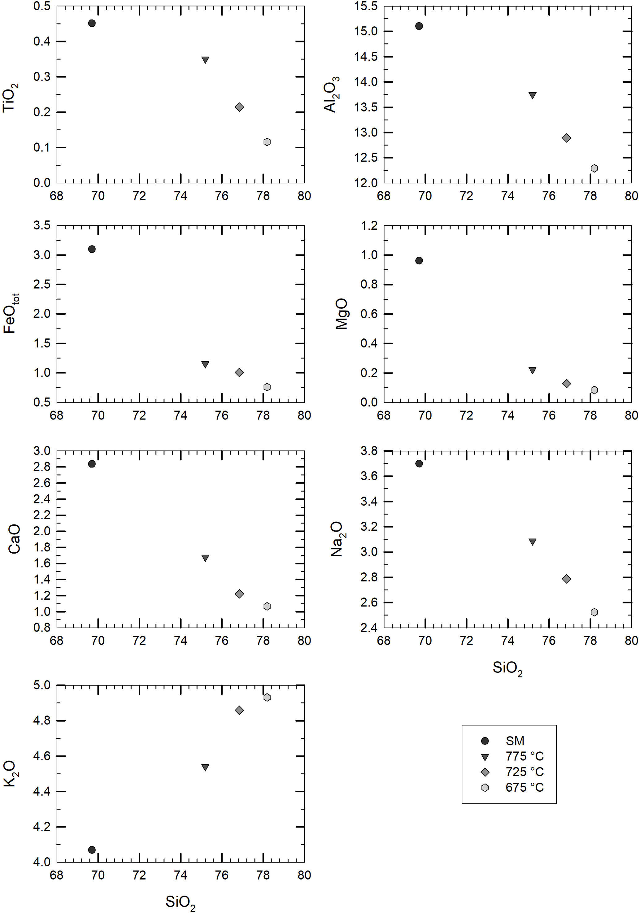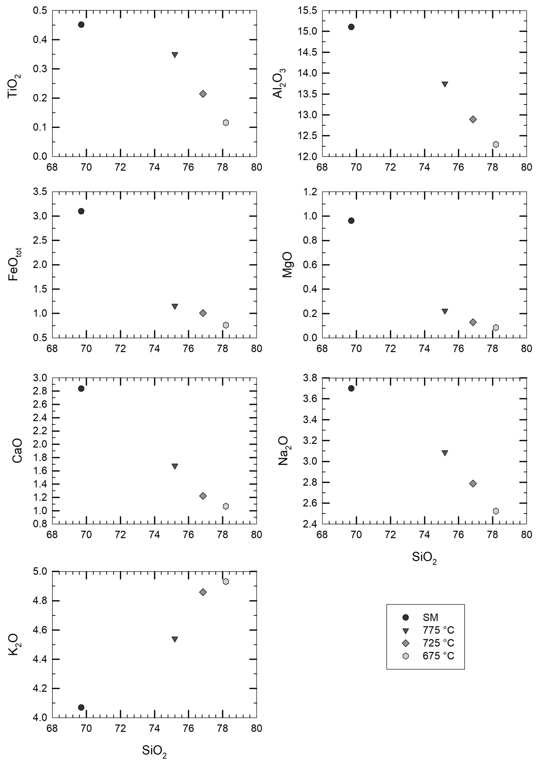 Major element compositions of experimental glasses obtained after the first-step experiments are given in Table 2 (data normalized to 100 % assuming an anhydrous composition) and are shown in Fig. 4 together with the composition of the starting material for comparison. SiO2 content in glass increases with decreasing T from ∼75 wt % at 775 °C up to ∼78 wt % at 675 °C, whereas CaO, Al2O3, FeO, MgO, and Na2O decrease with cooling and crystallization. Only K2O increases with crystallization from 4.5 wt % at 775 °C to 4.9 wt % at 675 °C, which is a further indication confirming that alkali feldspar do not crystallize in our experimental series. The composition of the mineral phases that could be analysed is given in Table S2.