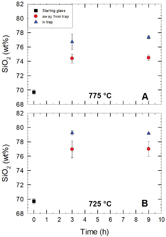 In the second-step experimental products, the compositions of glasses were investigated in two different domains: glasses away from the grain trap and glasses filling the space between the quartz trap. As mentioned above, dissolution of the quartz grains at the contact with trapped melts was expected. Figure 5 illustrates the enrichment of SiO2 in the glasses between the quartz grains of the traps of second-step experiments after 3 and 9 h at 775 and 725 °C. The analytical data are given in Table S4. The SiO2 content of glass faraway from the glass trap is identical within error to the initial SiO2 content (glass from first-step experiments). However, glasses within the trap are enriched by ∼2 wt % to 3 wt % in SiO2. This high SiO2 concentration of ∼78 wt %–79 wt % in the glasses within the quartz trap indicates that dissolution kinetics were fast enough to almost saturate melt pools with respect to quartz after 3 h.
