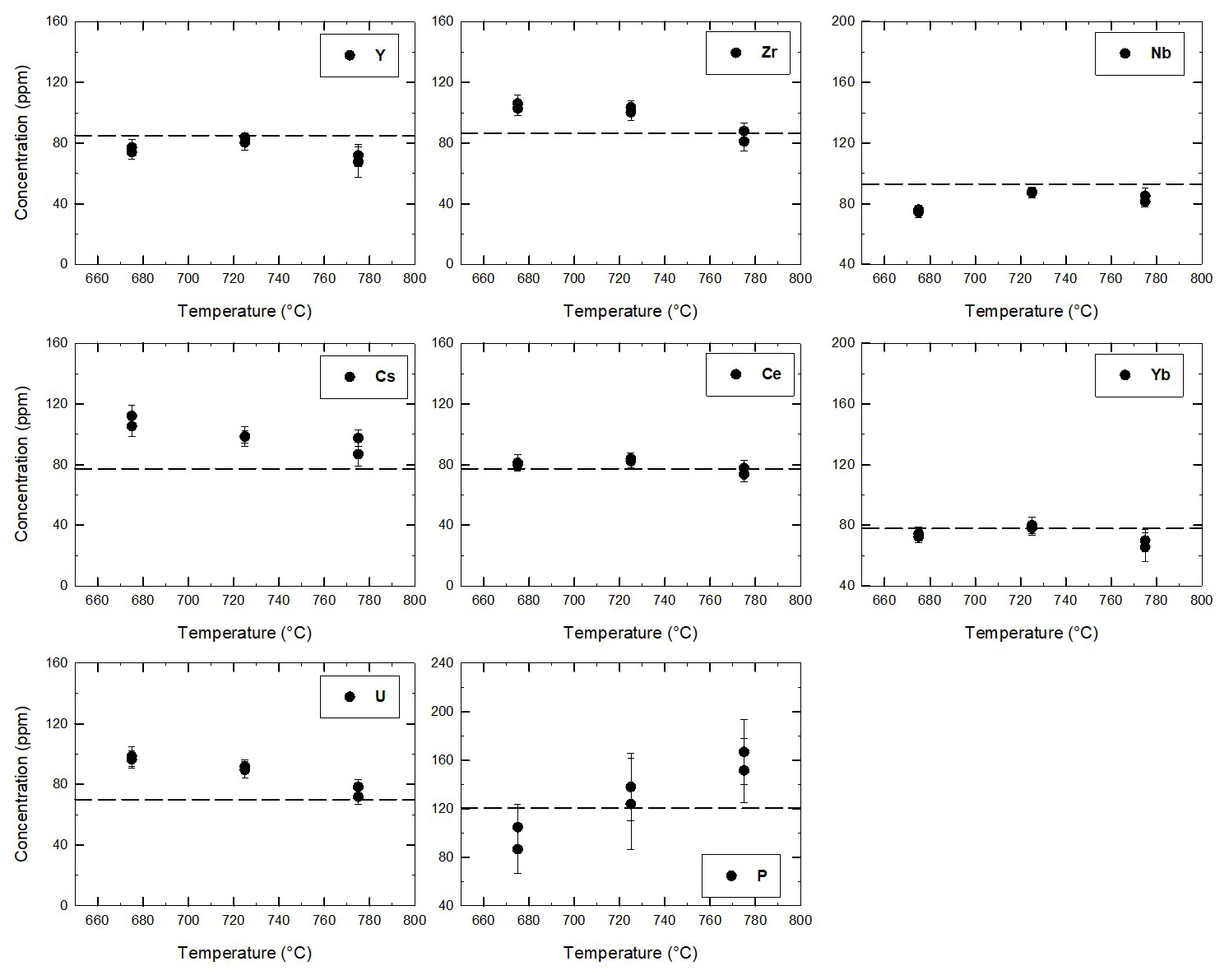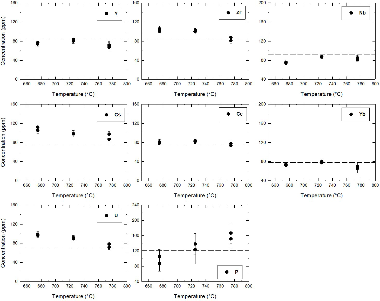 Figure 6Concentration of trace elements in glasses between the quartz trap obtained in Perugia by means of LA-ICP-MS for the three experiments at 675, 725, and 775 °C. The dashed lines mark the initial concentration in the starting glass. The experiments used to determine the trace element concentrations in glasses were duplicated, explaining why two points are plotted for each temperature.