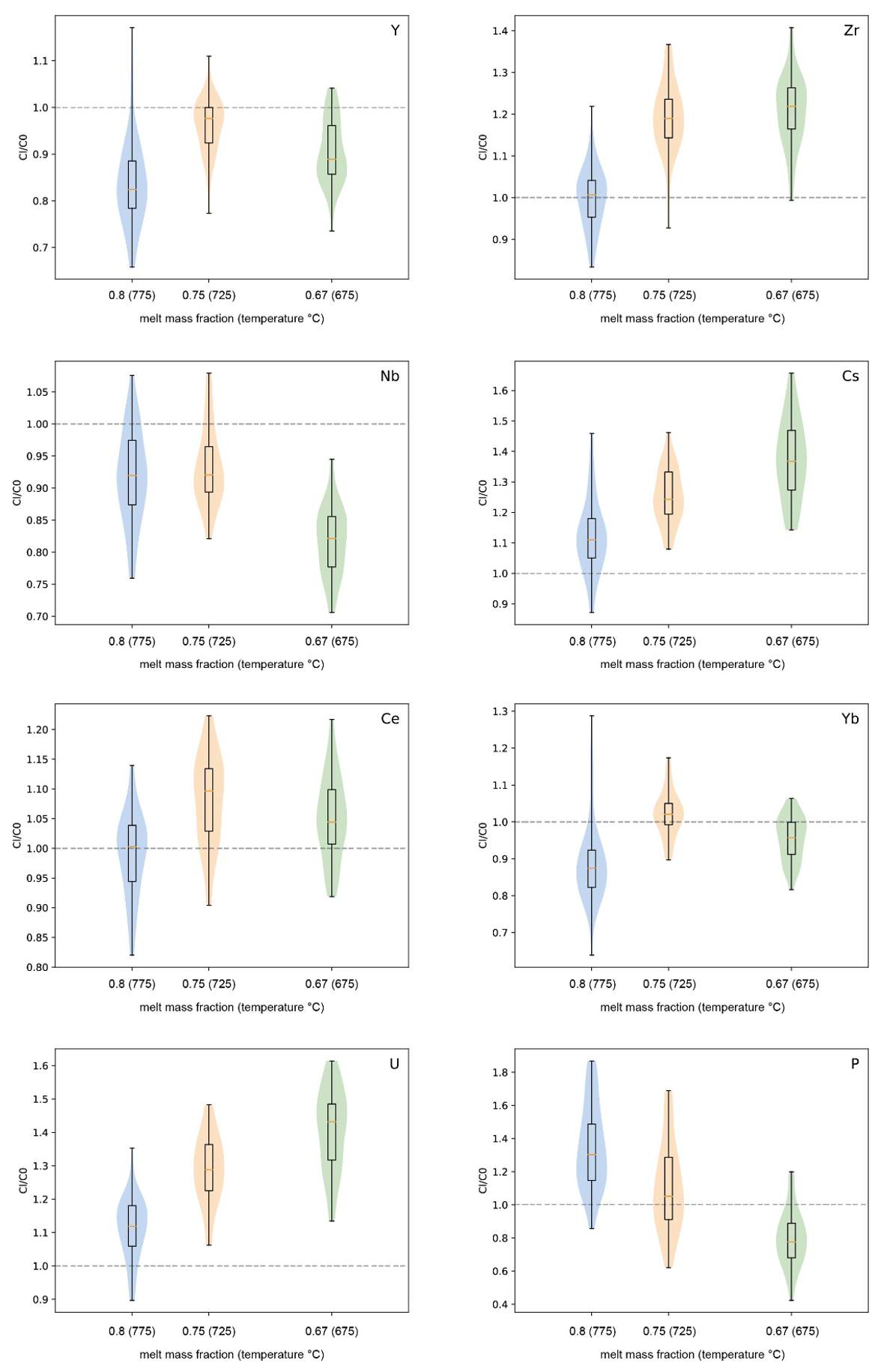 The enrichment or depletion of each trace element relative to the initial composition is expressed as , where Cl is the concentration of the element in the liquid (melt) after the experiment, and C0 is its initial concentration in the starting material. The ratio, obtained by Monte Carlo analyses, including the error propagation for the partition estimations, is reported in Fig. 7. As expected from the analytical results shown in Fig. 6, Cl is always higher than C0 for Cs and U, and clearly increases with decreasing melt fraction (or decreasing temperature) (see also Fig. S4), indicating that these elements demonstrate incompatible behaviour in the investigated system in the temperature range of 675–775 °C.