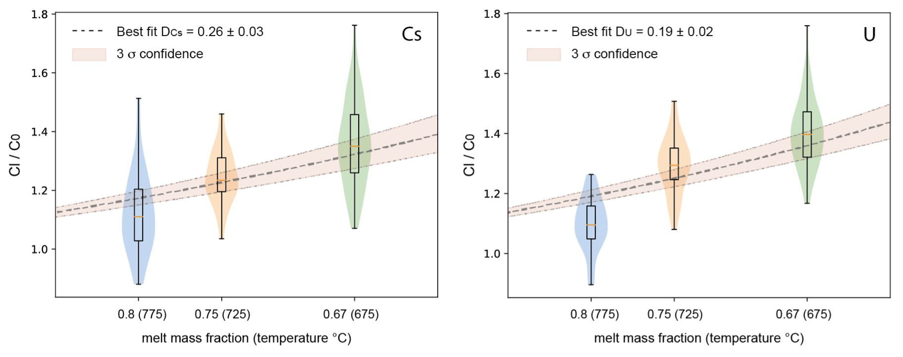 Figure 8Trace element concentration ratio between residual melt (Cl) and starting glass (C0), showing the enrichment of Cs and U in the residual liquid assuming a constant bulk partition coefficient between crystals and melt (DCs and DU, respectively; including error propagation by Monte Carlo analyses).