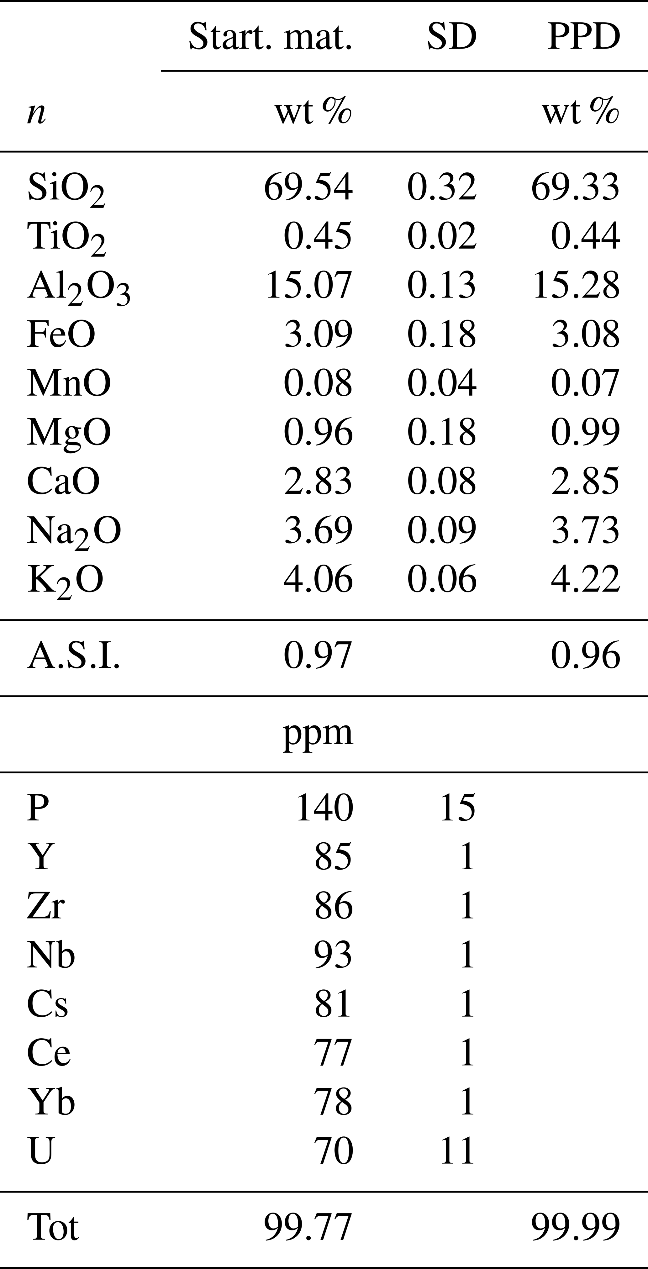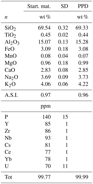 Note that the data are based on the average value of 25 microprobe analyses for major elements and 15 laser ablation analyses for trace elements. The major element composition of the natural reference material is also given (PPD: Pagosa Peak Dacite). A.S.I. refers to the Aluminium Saturation Index, calculated as Al2O3 (CaO + Na2O + K2O) on a molar basis.