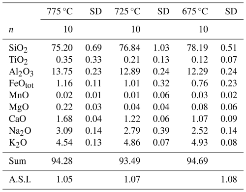 Note that the data are normalized to 100 %. “Sum” refers to the total prior to normalization. “n” refers to number of analyses. “SD” refers to 1 sigma standard deviation. A.S.I. refers to the Aluminium Saturation Index, calculated as Al2O3 (CaO + Na2O + K2O) on a molar basis.