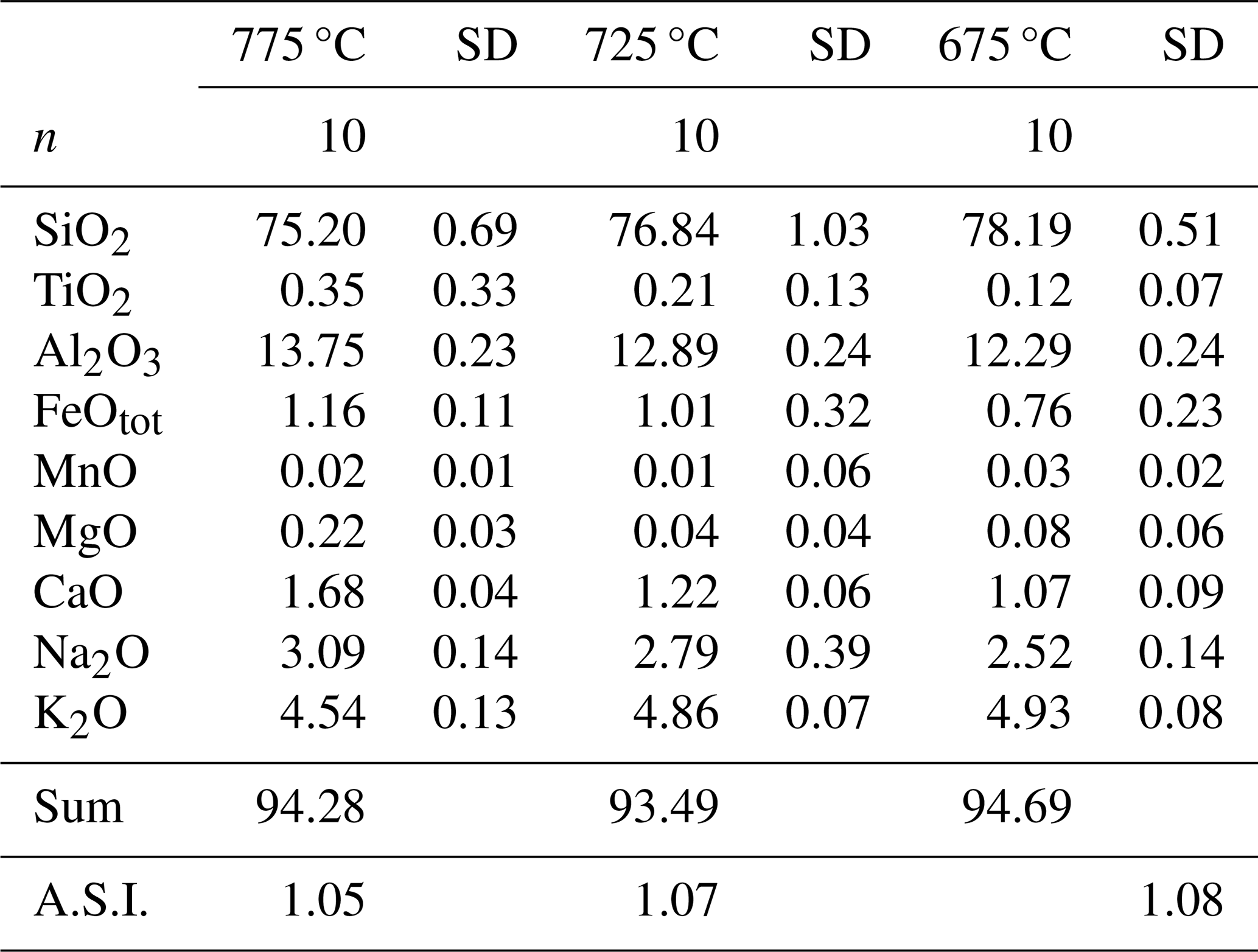 Mass balance calculations using a least-squares fit to the starting composition were performed for all runs to estimate the proportion of phases. The mineral compositions used for the mass balance calculation are given in Table S2. As mentioned above, only phases obtained in the experiments at 775 °C (plagioclase, amphibole, biotite, and magnetite) and 725 °C (plagioclase and magnetite) could be analysed accurately, and the compositions of these phases were used for mass balance calculations at 725 °C (amphibole, biotite at 775 °C) and 675 °C. The results of the phase proportions calculated by mass balance are displayed in Table 3 and Fig. S2. As expected, a decrease in glass proportion as temperature decreases is observed. The glass proportion is estimated to be 80 wt % at 775 °C and decreases to ∼67 wt % at 675 °C. Plagioclase proportions change from ∼13 wt % to 25 wt % as T decreases from 775 to 675 °C, whereas magnetite proportions remain approximately constant for all runs (1.3 wt %–1.6 wt %). A slight increase in the amount of biotite is calculated from the highest to lowest experimental temperature (Table 3).