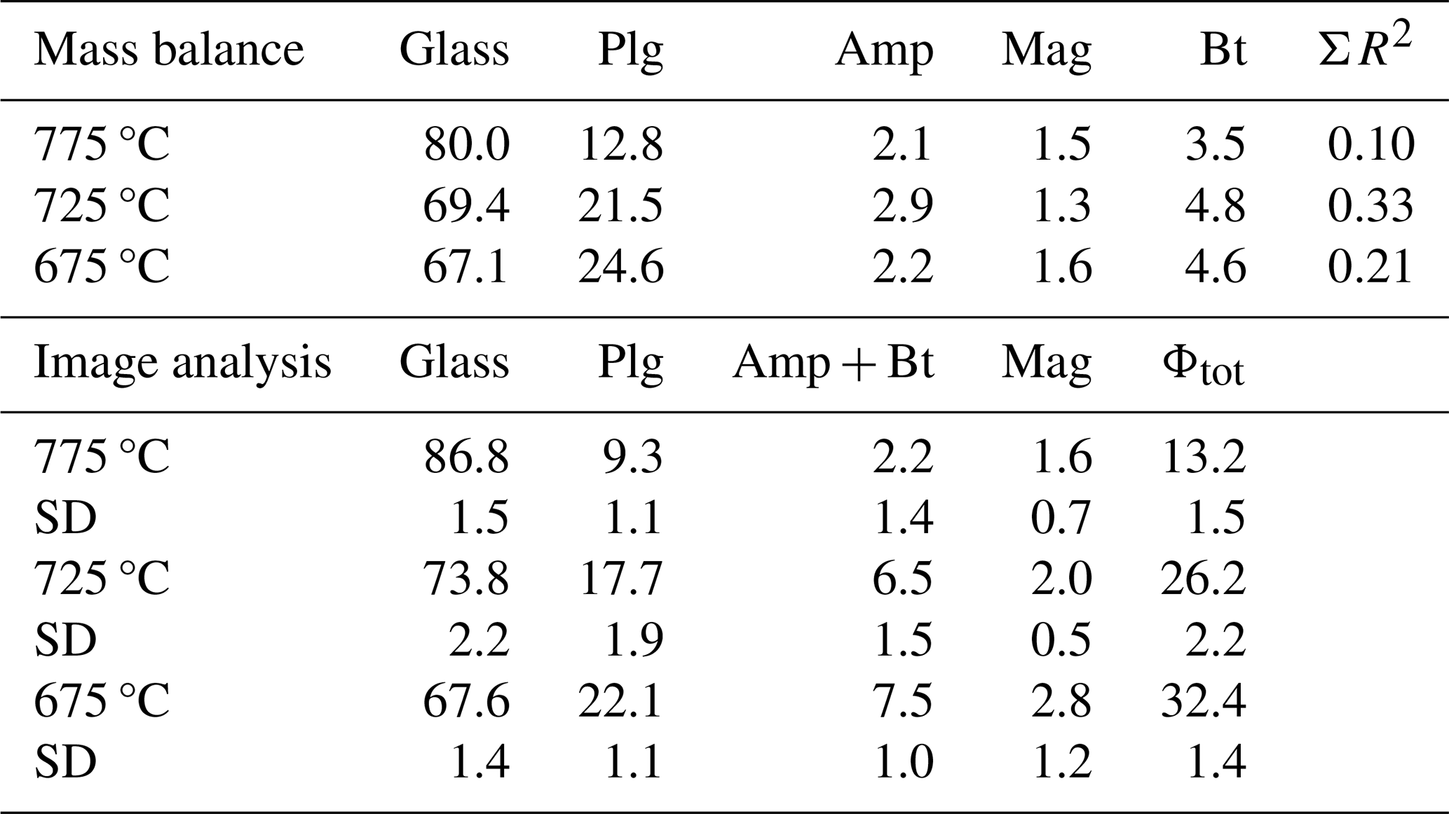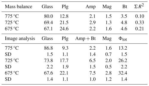 The proportion of phases estimated from image analysis conducted on BSE images of all first-step experimental run products are given in Table 3 and are shown in Fig. S2. As for mass balance calculations, glass is the most represented phase at all temperatures, decreasing from 87 area % at 775 °C to 67 area % at 675 °C. Plagioclase proportion increases from 9 area % to 22 area %. Amphibole and biotite are not distinguishable by the grey scale in BSE images and are therefore classified as one population (Table 3). The amount of magnetite is estimated to be 1 area %–2 area %.
