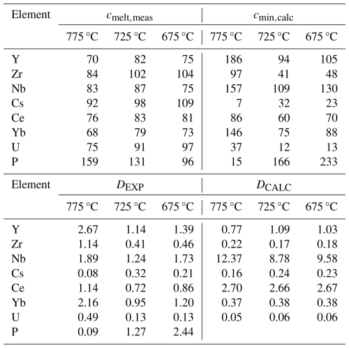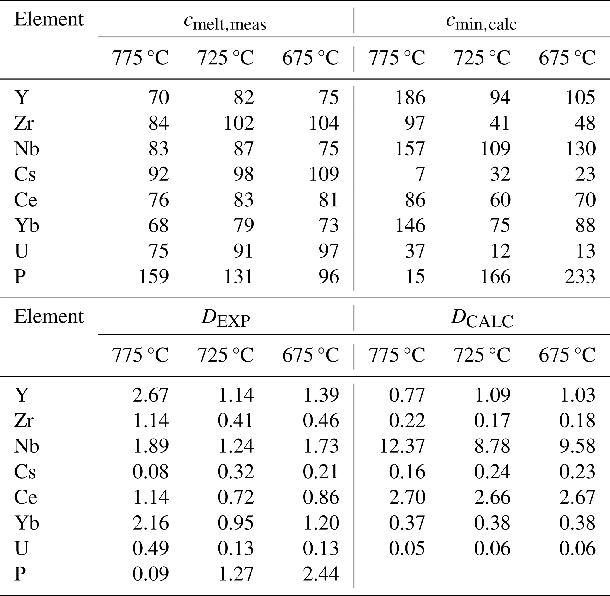 The bulk Dcalc values calculated using partitioning coefficients published so far differ in part from the Dexp values derived from experimental data. For Yb, the calculated values are below 1, but our values are close to or above 1, indicating that Yb may be less incompatible than expected and that calculated partitioning values for Yb may be underestimated for amphibole. Calculated values are significantly higher than for Nb, which could indicate that Nb may be more incompatible than expected in magnetite-bearing systems. However, a small variation in the estimated amount of magnetite may affect the calculated D values significantly. For example, if the oxide concentration were to be 0.5, 1, and 1.5 at 775, 725, and 675 °C, respectively, the would be in the range of 5.5 to 6 (Table 4). Values for are in the same range as those observed experimentally, especially at 725 and 675 °C. The values at 775 °C are lower than , but this may be due to an underestimation of the amounts of biotite and amphibole in the experiment. If the proportions estimated by mass balance are considered (∼5 % biotite + amphibole), the at 775 °C is 1.46 (Table 4), which fits better with the Y trend determined experimentally. For Ce, the higher calculated D values most probably indicate that the applied partitioning coefficient for Ce in plagioclase is too high or that apatite may also influence the Ce budget.